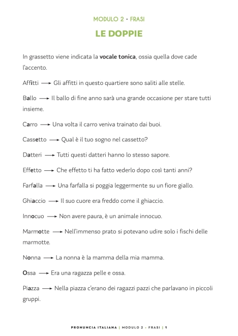 - LINEE GUIDA (PDF): Indicazioni dettagliate su come usare il materiale del modulo- VIDEO-LEZIONE: Lezione dettagliata con sottotitoli su un particolare suono. Imparerai come muovere e usare i muscoli della bocca per riprodurre correttamente i suoni della lingua italiana- FRASI (PDF+MP3): 20 frasi lette da due professionisti della voce - FOCUS (PDF+MP3): Un testo su un argomento molto interessante legato all'Italia letto da 2 voci diverse (una voce maschile e una voce femminile)- VIDEO EXTRA: Un video divertente e didattico, dove mamma Tiziana e nonna Elide ti guideranno nella giusta pronuncia dei 10 suoni più difficili della lingua italiana.
